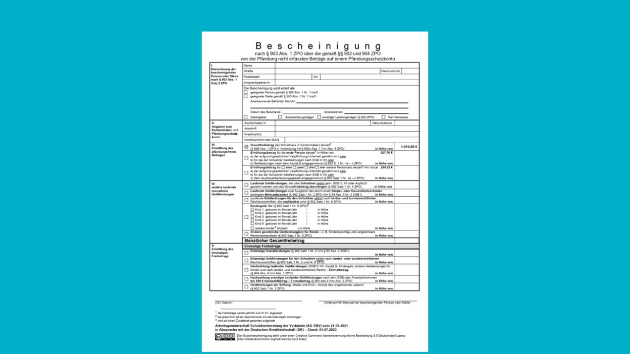 Mit dieser Bescheinigung und den gemachten Eintragungen zeigt du deiner Bank: „Mir steht mehr Geld zu, bitte schütze das vor der Pfändung.“ Die Bank muss die Bescheinigung schnellstmöglich umsetzen. Eine detaillierte Liste der freizustellenden Beträge findest du hier.